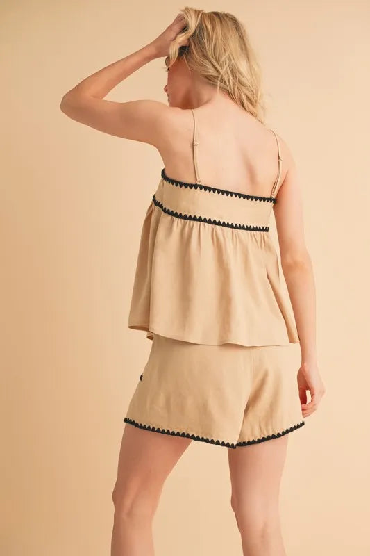 Rickrack trim shorts are shorts that are decorated with rickrack trim along the hem or seams. Rickrack trim is a zigzag or wavy patterned trim that adds a playful and retro touch to the shorts. These shorts are perfect for adding a fun and decorative element to your summer wardrobe, making them a stylish and eye-catching choice for warm weather outfits.