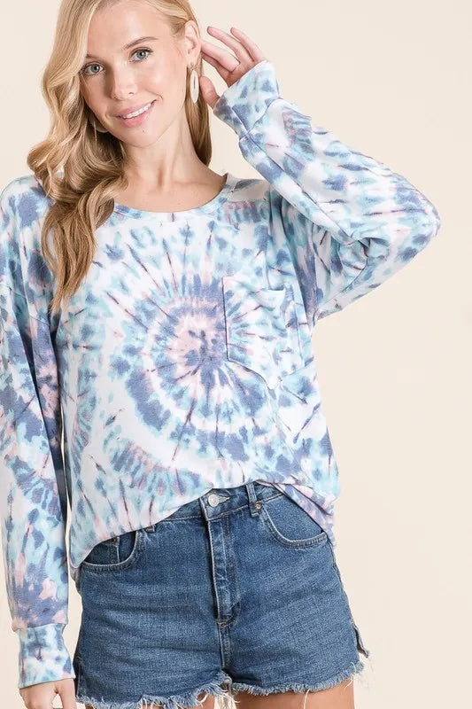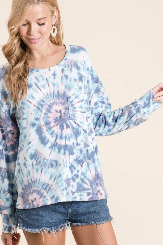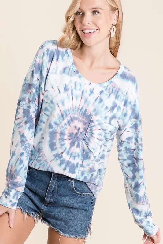 BiBi Tie Dye Print Terry Top with Front Patch Pocket