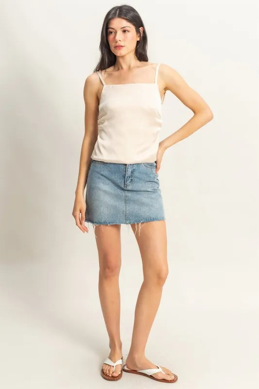 The satin back tie detail cami is a sophisticated and luxurious piece that adds a touch of elegance to your outfit. The satin fabric offers a silky and smooth texture, perfect for dressing up any look. The back tie detail adds a feminine and chic element, allowing you to adjust the fit to your liking. This cami is versatile and can be styled in various ways - wear it alone with jeans or dress it up with a blazer and trousers for a more formal look. The satin fabric and tie detail create a sleek and stylish ensemble that is perfect for both casual and dressier occasions.