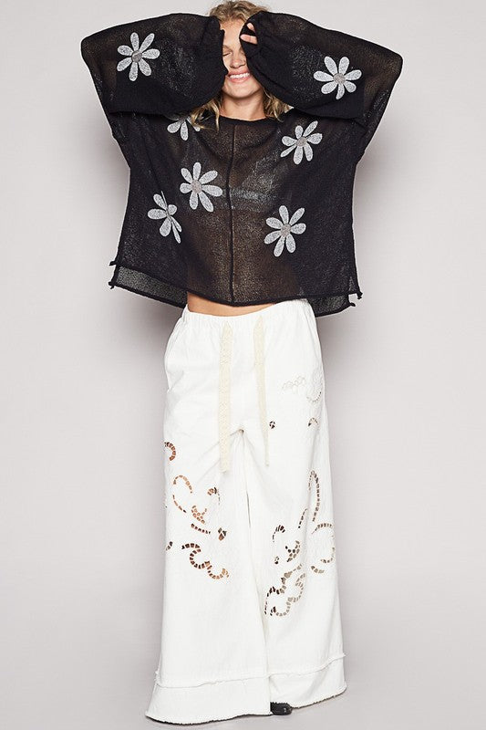 POL Flower Roll Edge Round Neck Drop Shoulder Knit Top