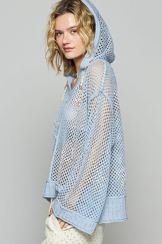 POL Star Openwork Long Sleeve Hooded Knit Cover Up