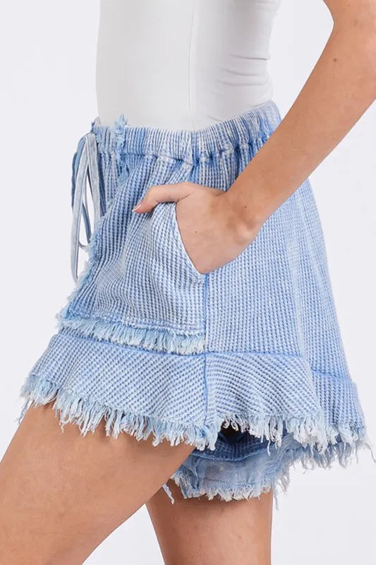 - Features: Pocketed, Raw Hem, Drawstring, Waffle-Knit