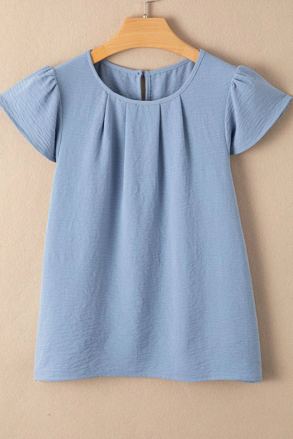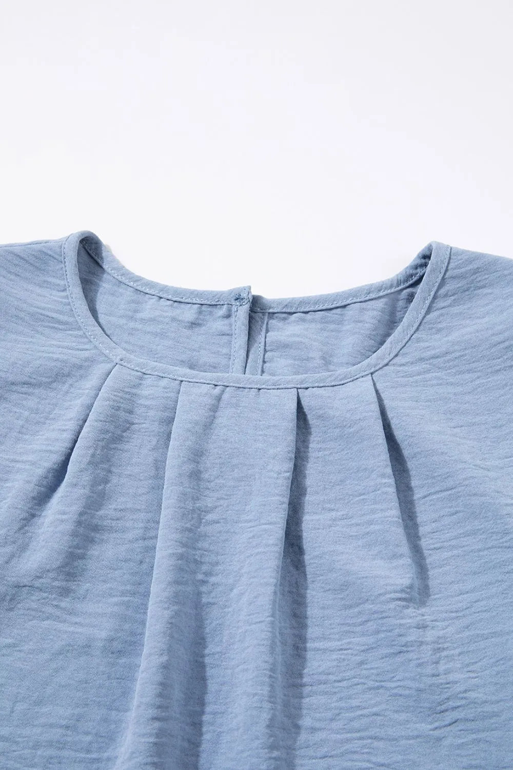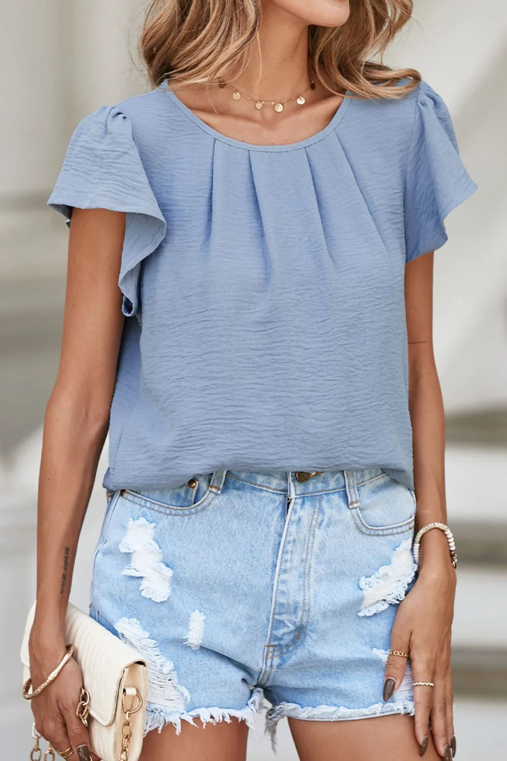 Solid Color Flounce Sleeve Pleated Round Neck Blouse
