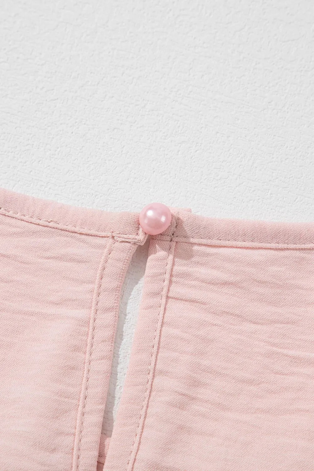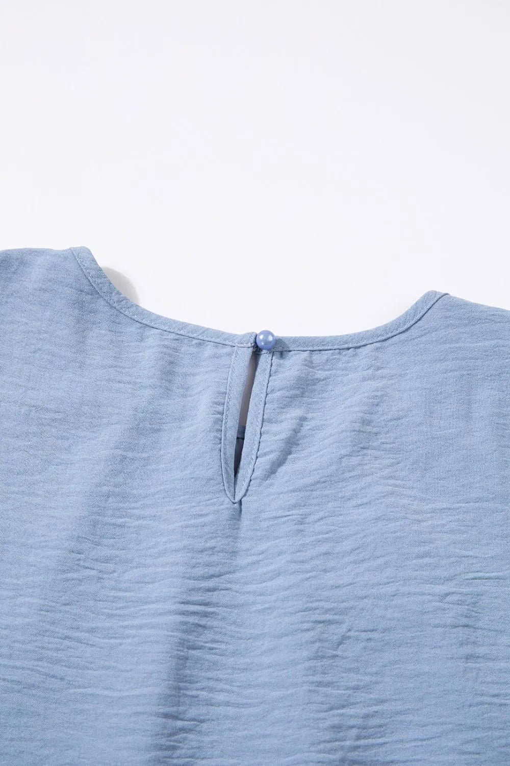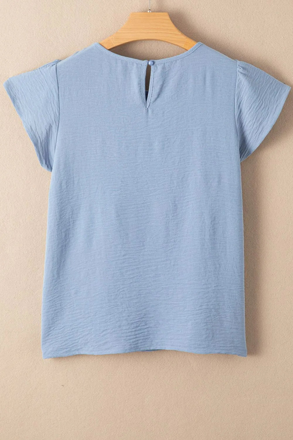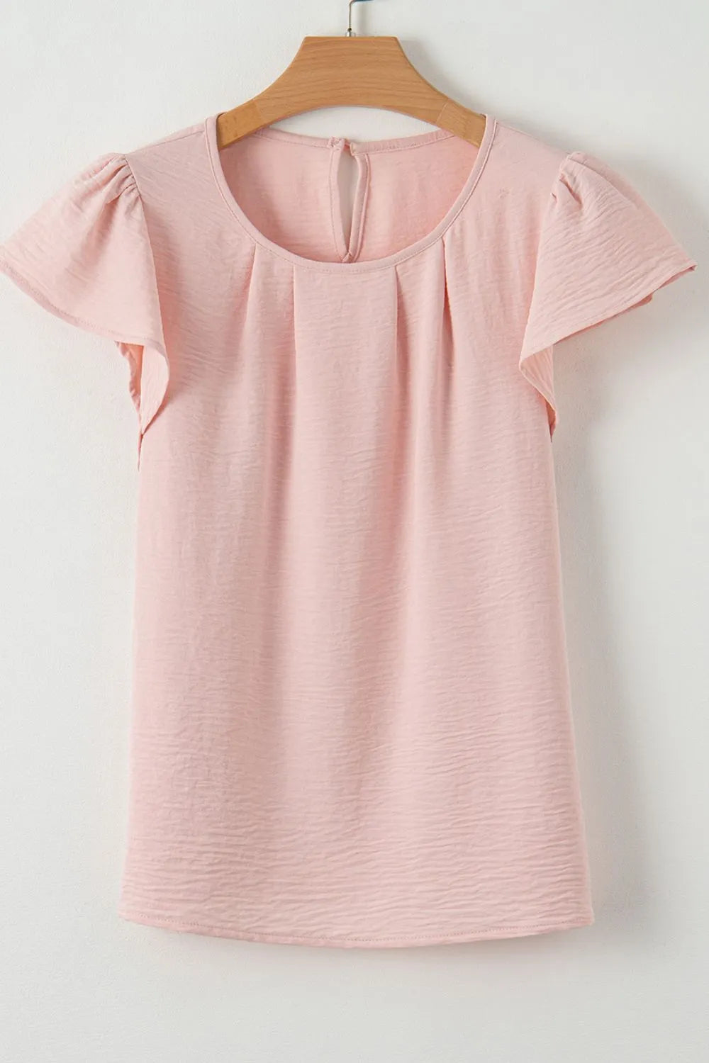 Solid Color Flounce Sleeve Pleated Round Neck Blouse