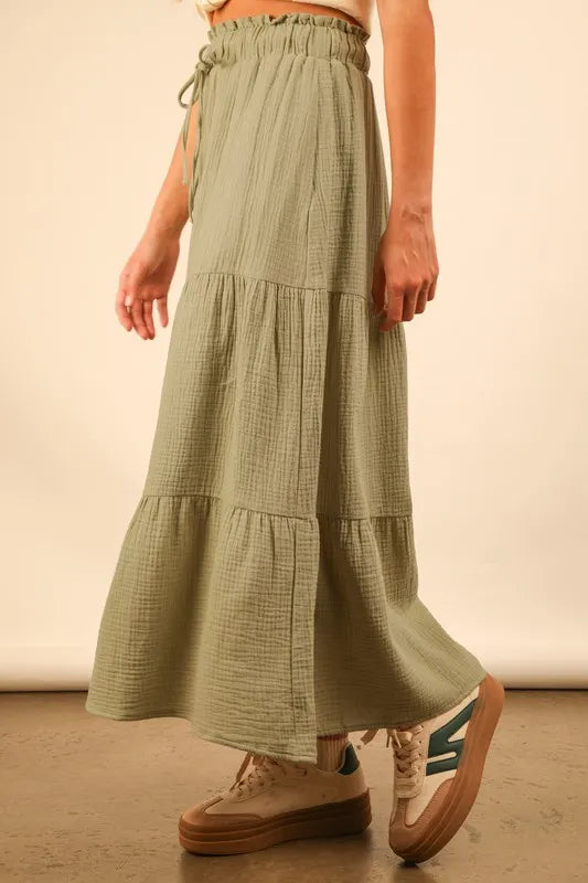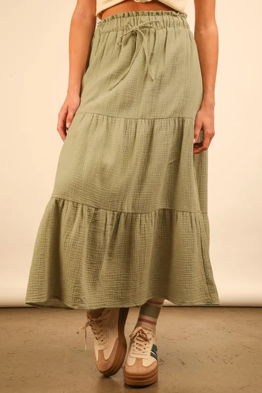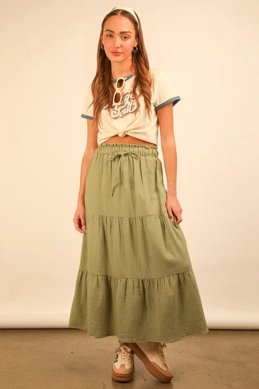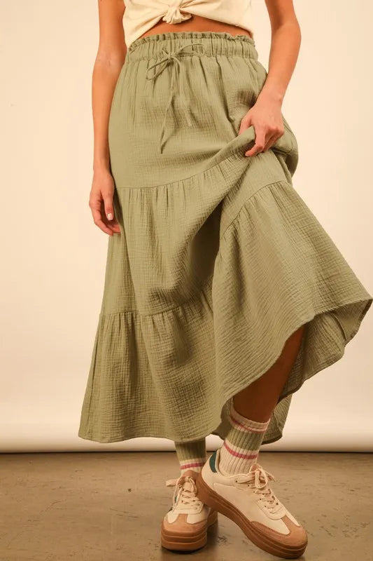An elastic waist tiered maxi skirt typically features multiple layers of fabric that gradually increase in length towards the bottom, creating a flowy and bohemian look. The elastic waistband provides comfort and flexibility in sizing, making it easy to slip on and off. This versatile skirt can be dressed up or down and is a must-have fashion piece for any wardrobe.