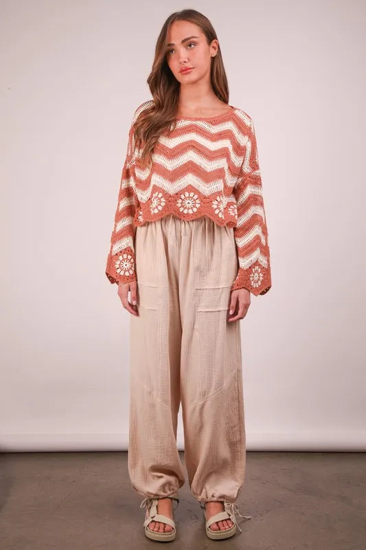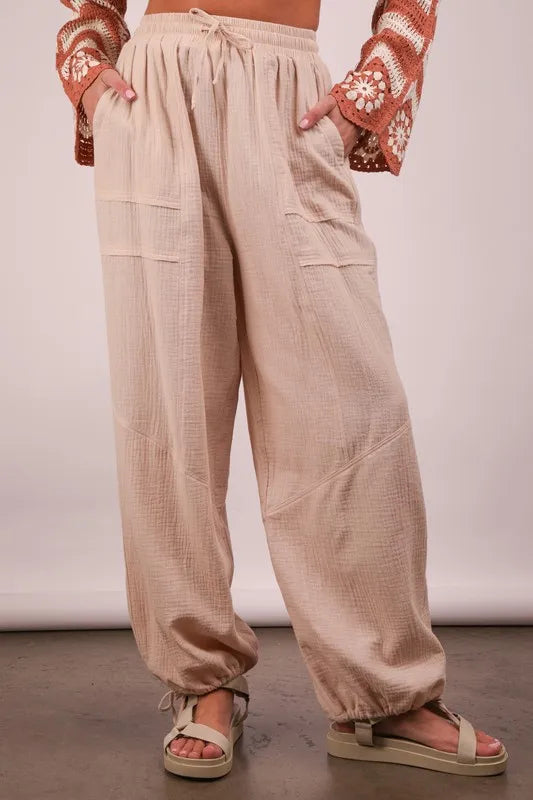 Wide leg gauze solid pants are loose-fitting trousers made from a lightweight and airy gauze fabric. With a wide leg silhouette, these pants offer a relaxed and comfortable fit while providing a breezy feel for warm weather. The solid color adds versatility, allowing these pants to be easily paired with various tops for a chic and effortless look.