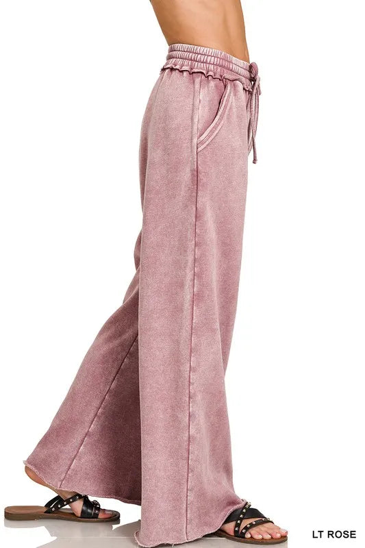 Zenana Acid Wash Fleece Palazzo Sweatpants with Pockets